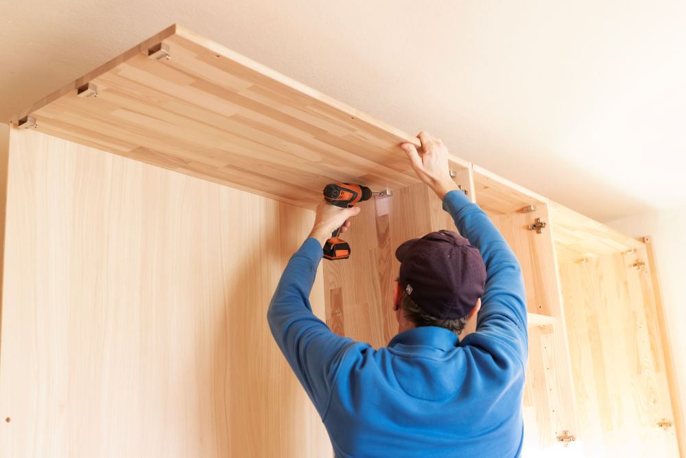 Eventuelle ergänzende Befestigungen an der Wand wie zum Beispiel Kippsicherung bei hohen Regalen und Schränken oder das Montieren von Hängeschränken an der Wand übernehmen wir gerne. Auch hier haben wir die passenden Materialien immer mit dabei wie Dübel, Schrauben, Schlagbohrmaschine, Wasserwaage, …